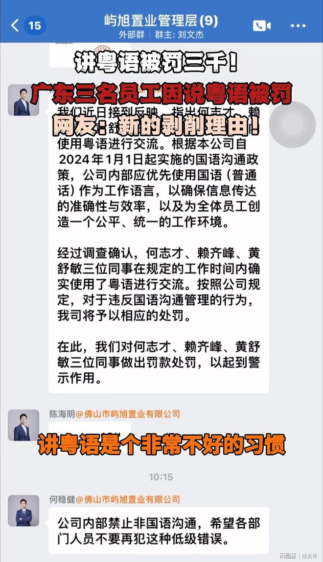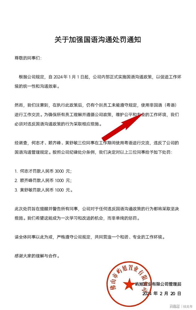 佛山屿旭置业三名员工上班讲粤语被罚五千元,此公司涉嫌违法