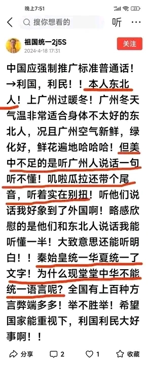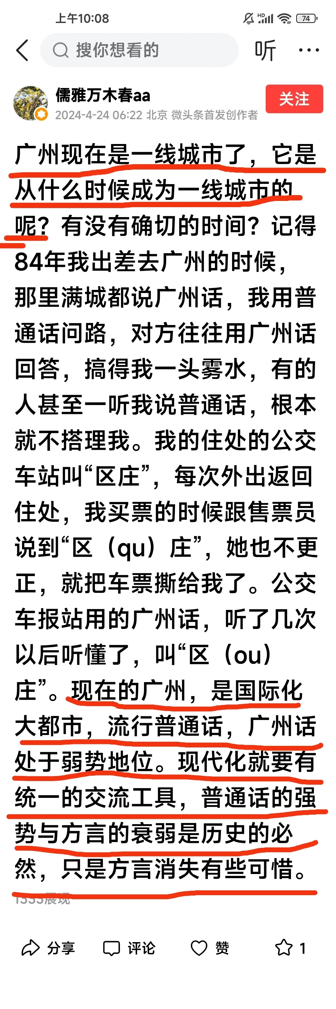 居然有人把广州成为一线城市,成为国际大都市归功于普通话(图一),推广普通话把普通话推广成神话了。怪不得认为自己讲着标准普通话的人在广州这么嚣张跋扈(图二)。